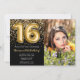 Foto elegante convite de aniversário preto e dourado 16 para uma menina de 16 anos com roteiro elegante escrevendo fonte dourada e balões de folha divertida.
