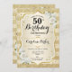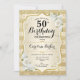 Elegante convite floral feminino de 50 anos com sua foto no final do cartão. Design de vidro com ouro brilhante falso. Apresenta faixas de ouro, rosas brancas, fontes de script e confetti. Perfeito para uma festa de comemoração de na moda adulto. Personalize com seus próprios detalhes. Pode ser personalizado para qualquer idade! Impressos convites Zazzle ou modelo de impressão digital instantânea para download.