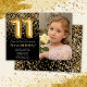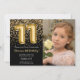 Foto elegante convite de aniversário preto e 11 de ouro para uma menina de 11 anos com script elegante, escrevendo design de fonte dourada e balões de folha divertida.