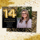 Foto elegante convite de aniversário preto e 14 de ouro para uma menina de 14 anos com roteiro elegante escrevendo fonte dourada e balões de folha divertida.