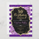 Elegante convite floral feminino de 50 anos com sua foto no final do cartão. Design preto branco roxo com ouro brilhante. Apresenta faixas, rosas roxos, fontes de script e confetti. Perfeito para uma festa de comemoração de na moda adulto. Personalize com seus próprios detalhes. Pode ser personalizado para qualquer idade! Impressos convites Zazzle ou modelo de impressão digital instantânea para download.