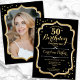 Elegante 50º convite de aniversário com sua foto no fundo do cartão. Design preto de vidro com ouro brilhante falso. Possui fonte de script e confetti. Perfeito para uma festa de comemoração de na moda adulto. Personalize com seus próprios detalhes. Pode ser personalizado para qualquer idade! Impressos convites Zazzle ou modelo de impressão digital instantânea para download.