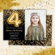 Fotografe o Elegante convite de festas de 4 anos preto e dourado para uma menina de 4 anos com um roteiro elegante, escrevendo design de fonte dourada e balões de folha divertida.