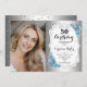 Elegante convite floral feminino para o 50º aniversário com sua foto. Glam design com falso prata. Apresenta rosas azuis leves, fontes de script e confetti. Perfeito para uma festa de comemoração de na moda adulto. Personalize com seus próprios detalhes. Pode ser personalizado para qualquer idade! Impressos convites Zazzle ou modelo de impressão digital instantânea para download.