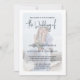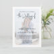 Esta design apresenta uma fotografia minimalista moderna, código QR rsvp via website, digital digitalizável online, um texto elegante azul empoeirado, camada branca de casal de fotografia noivado, uma típica camada simples e romântica de tipografia de caligrafia, estilo vellum de camada de chic, um moderno e simples romântico de elegância, com detalhes de casamento mais informações