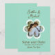 Este Save the Date personalizado para o anúncio do casamento apresenta um tema retrô, inspirado nos anos 70. O fundo é uma cor azul turquesa suave, com texto marrom e os nomes do casal impressos em uma fonte de letra elegante. Uma flor branca estilo anos 70 é impressa no centro. Uma foto de amostra é colocada dentro da moldura da flor que pode ser personalizada para incluir sua própria foto personalizada ou outra imagem.