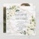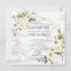 Moderno e moderno, este design de convite de casamento quadrado apresenta um falso geométrico geométrico de cobre embelezado com rosa branco de água e arranjos florais de eucalipto, sobre uma textura falsa de mármore branco. A parte traseira da placa apresenta sua foto favorita do noivado. Copyright Elegant Invites, todos os direitos reservados.