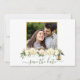 Esta fotografia floral romântica e chica salva a data design de casamento mostra sua própria foto e uma bela combinação de lanternas românticas e linhas de cordas com cores vivas e elegantes peonias brancas, rosas brancas e verde em fundo branco com quadros de ouro. Fácil de personalizar com sua própria foto e informações, e a cor de fundo também é personalizável. Estas cartas são perfeitas para o casamento romântico do celeiro, casamento de fazenda, ou qualquer lugar rústico e romântico. Design de T.K. em frente. A coordenação dos artigos de casamento está disponível na minha coleção Elegante White Peonies e Rustic Dourada Lanterns na minha loja Zazzle: