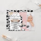 Foto Floral Pink Boho primeiro aniversario Santa Vaca Convite Vaca Sagrada Vaca Fofa recebeu o primeiro convite de aniversário de uma menina com uma vaca branca e negra fofa, um padrão de impressão de vaca e alguns adoráveis arranjos florais cor-de-rosa. Este convite para primeiros aniversarios de vaca também apresenta um grande número de cor esfregada e um banner parecido com madeira. Excelente para a primeira festa de aniversário de uma vaca sagrada.