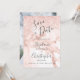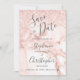Um design moderno, chic, com um elegante fundo de mármore, aparado com brilho falso em tons de ouro rosa, cor-de-rosa e branco. As palavras "Salvar a Data" e os primeiros nomes da noiva e do noivo aparecem no script de cinza de carvão, com o texto restante na fonte sans serif. Substitua facilmente a imagem no verso por uma foto vertical do casal.