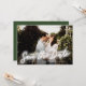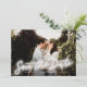 Isso salve a data com uma inscrição fina sobre uma foto horizontal. Este modelo também tem um design de trás para uma foto adicional opcional e detalhes como o site do seu casamento. A cor verde no verso pode ser alterada para qualquer cor que você queira na janela de personalização!