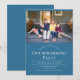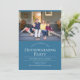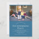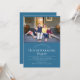 Um convite para o lar com texto personalizável. A foto é uma modelo e deve ser trocada por você. O convite tem um fundo azul e um texto branco. Design de Feriado de Natal para o Convite Azul de Fotografia Moderna | Melissa Patton - Designer<i>Fotografia © Storytree Studios, Stanford, CA</i>