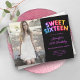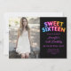 Elegante Doce Dezesseis Convite de aniversário com balões de aniversário do Rainbow, um espaço personalizado para fotografia e uma tipografia moderna.