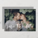 Cartão moderno de salvar a data com "Save the Date" exibido em uma escrita em branco estilo aquarela sobreposta à sua foto de engajamento horizontal. Personalize a frente do cartão de salvar a data com suas fotos com seus nomes, data do casamento, local do casamento, etc. O verso do cartão reverte para um fundo cinza sólido ou cor de sua escolha. Adicione texto e imagens adicionais para um design único! Disponível para download instantâneo, cartões impressos ou ambos.