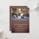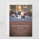 Um convite para o lar com texto personalizável. A foto é uma modelo e deve ser trocada por você. O convite tem um fundo castanho e um texto branco.