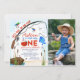Blue Fish Boat Photo Ofishally Um primeiro aniversario Convite Rapazes Cutes pescando o primeiro aniversário convite com um carretel de pesca, peixe azul, barco, cauda de algodão, pesca e moscas dragão. Este convite de um aniversário para o "o-fish-ally" também apresenta uma foto e é ideal para uma primeira festa de aniversário temática de pesca.