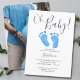 Foto: Convite Para Chá de fraldas Do Baby Boy. Envie estes convites simples e na moda para o chá de bebê para a família e amigos. Eles são decorados com tipografia moderna e pés de bebê pintados a aquarela bonitinhos pintados à mão em azul pastel. Adicione sua própria foto ao convite. Porque nós criamos nosso próprio trabalho de arte você não encontrará essa imagem exata de outros designers. Personalize esses convites com seu nome e detalhes. Original Watercolor © Michele Davies.