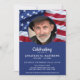 U.U.A.: Memorial Funeral Celebration Of Life Invitation. Esta celebração patriótica do convite à vida apresenta uma bandeira dos Estados Unidos da América num moderno design azul vermelho. Personalize esta bandeira americana celebrando o convite à vida com seus entes queridos foto, nome e datas, local do evento. Este convite para o funeral de fotos da American Flag será um tesouro guardião. Perfeito para um funeral militar, serviço memorial veterano ou celebração militar da vida. Na Memória Militar Memorial, Bandeira Americana. COPYRIGHT © 2020 Judy Burrows, Black Dog Art - Todos Os Direitos Reservados. Foto Patriótica Americana Celebração Do Convite À Vida