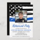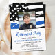 Convites de aposentadoria da polícia de linha azul fina. Celebre anos de serviço dedicado e convide amigos e familiares para a sua festa de aposentadoria na polícia com este Convite para aposentadoria da Polícia de Sinalizador Azul Thin. DESIGN americano na Polícia de Sinalizador, cores modernas, preto branco e design azul. Este convite para aposentadoria de policial também é perfeito para convites para formatura na academia de polícia, mudança de local na personalização. Veja nossa coleção para combinar presentes de aposentadoria da polícia, favoritos para festas de aposentadoria da polícia e suprimentos. COPYRIGHT © 2021 Judy Burrows, Black Dog Art - Todos Os Direitos Reservados. Convite Personalizado de Fotografia do Agente de Polícia para Retirada