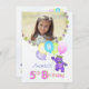 5 festa de aniversário com nome personalizado e convite fotográfico com uma princesa de ursinho roxo e fofinho vestida com uma adorável coroa amarela e acessórios de flores rosa, azuis e verdes segurando um monte de balões com a palavra FESTA neles. Personalizar com a foto e o nome da criança o torna especial. É um tema real divertido para uma princesa especial. design original de Anura Design Studio.