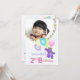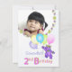Nome e convite de fotografia do segundo aniversário, com fofinho e bonitinho urso de pelúcia roxo, vestido com uma adorável coroa amarela e acessórios de flores rosa, azuis e verdes, segurando um monte de balões com a palavra PARTIDO neles. Personalizar com a foto e o nome da criança o torna especial. É um tema real divertido para uma princesa especial. design original de Anura Design Studio.