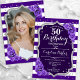 Elegante convite floral feminino de 50 anos com sua foto no final do cartão. Design branco roxo de vidro com prata brilhante. Apresenta faixas, rosas roxos, fontes de script e confetti. Perfeito para uma festa de comemoração de na moda adulto. Personalize com seus próprios detalhes. Pode ser personalizado para qualquer idade! Impressos convites Zazzle ou modelo de impressão digital instantânea para download.