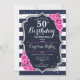 Elegante convite floral feminino de 50 anos com sua foto no final do cartão. Design branco-cor-de-rosa com marinho brilhante com prata fluorescente. Apresenta faixas marinho azul e branca, rosas cor-de-rosa-bebê, fonte de script e confetti. Perfeito para uma festa de comemoração de na moda adulto. Personalize com seus próprios detalhes. Pode ser personalizado para qualquer idade! Impressos convites Zazzle ou modelo de impressão digital instantânea para download.