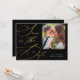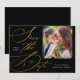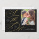 Esse negro romântico e ouro salvam a data com a caligrafia moderna e uma foto. "Save the Date" (Salvar a data) é escrito na carta em uma elegante caligrafia em ouro. À direita do roteiro, você pode adicionar uma foto quadrada. Seus nomes, data do casamento e local do casamento são colocados exclusivamente na design de tipografia.