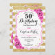 Elegante, floral, 50º aniversário feminino com sua foto no final do cartão. Design cor-de-vidro branco, rosa com ouro brilhante falso. Apresenta faixas, rosas cor-de-rosa-bebê, fontes de script e confetti. Perfeito para uma festa de comemoração de na moda adulto. Personalize com seus próprios detalhes. Pode ser personalizado para qualquer idade! Impressos convites Zazzle ou modelo de impressão digital instantânea para download.