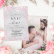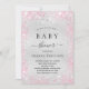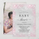 Um chá de fraldas moderno, elegante, celebrando uma menina. Fundo de aspecto fino prateado decorado com brilho sujo rosa. Personalize e adicione um nome e detalhes da parte. Letras pretas coloridas. Voltar: adicionar uma foto