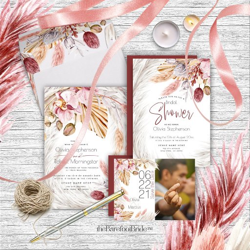 Convites Foto: Rustic Burgundy Pink Ivory Pampas Gras
