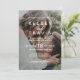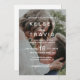 O convite para casamento de fotos com seus nomes em uma fonte grande junto com seus detalhes de casamento em um formato moderno em branco sobre sua foto favorita. As palavras "e", assim como "recepção a seguir", estão em um roteiro com balanços elegantes e a modelo apresenta uma redação informal para um toque casual.