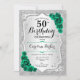 Elegante convite floral feminino de 50 anos com sua foto no final do cartão. Design com falso brilho de prata. Possui faixas prateadas, rosas esmeraldas verdes, fonte de script e confetti. Perfeito para uma festa de comemoração de na moda adulto. Personalize com seus próprios detalhes. Pode ser personalizado para qualquer idade! Impressos convites Zazzle ou modelo de impressão digital instantânea para download.