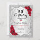 Elegante convite floral feminino de 50 anos com sua foto no final do cartão. Design com falso brilho de prata. Possui faixas prateadas, rosas vermelhas, fontes de script e confetti. Perfeito para uma festa de comemoração de na moda adulto. Personalize com seus próprios detalhes. Pode ser personalizado para qualquer idade! Impressos convites Zazzle ou modelo de impressão digital instantânea para download.