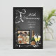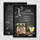 Convite personalizado e elegante para festa de aniversário de 25 anos ou qualquer outro ano. Adicione sua foto digital! Convites bonitos e festivos apresentam design preto e branco com padrão elegante e ondulado e duas taças de champanhe espumante com garrafa de champanhe com tonalidade esverdeada para celebrar o grande dia dos convidados de honra. Fundo preto e prateado com espirais pretas e brancas