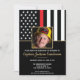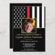 Este design apresenta uma bandeira de bombeiros com listras pretas e brancas, e uma fina faixa vermelha também. "Parabéns" e uma foto do bombeiro fica acima de todos os detalhes da festa para o bombeiro aposentado, tenente ou festa de aposentadoria do chefe.