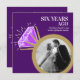 Convide seus amigos e família para uma festa especial de sexto aniversário de casamento ou comemoração jantada com esse roxo escuro, ametista roxo brilhante, brilho branco e anel de eternidade gráfico dourado, com duas fotos da época, e agora convites. Personalizado com suas próprias fotos do dia do casamento do seu casal e uma foto atual no verso, então adicione suas próprias palavras de celebração, data da festa e local. Outros itens correspondentes estão disponíveis. Arte gráfica e design original em anel, por www.mylittleeden.com no Zazzle.