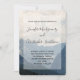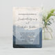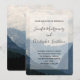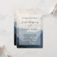Um convite de casamento com uma fotografia de belas montanhas, um céu nublado e colinas onduladas cheias de árvores em primeiro plano. Esquema de cores azul cinza.