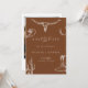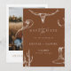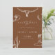 Celebre seu amor com este cartão de "save the date" de casamento rústico western cowboy. Este design apresenta ilustrações western desenhadas à mão, incluindo um crânio de longhorn, cacto, botas de cowboy, ferradura e chapéu em um fundo terracota quente. Perfeito para casais que planejam um casamento country, de ranque ou com tema western.
