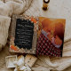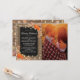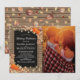 Convites de casamento rústicos com colheita com um fundo de madeira chique country, centro de quadro-negro preto, corda, abóboras de halloween, folhagem de outono, bolotas, uma dispersão de folhas de outono, luzes cintilantes, uma foto dos futuros noivos e um modelo de casamento personalizado.