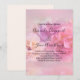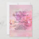 Um convite de casamento com uma fotografia com um buquê de cravos rosa e branco. Situado em um fundo etéreo sonhador.