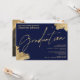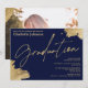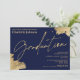 Um convite de formatura de paisagem moderno, chique e elegante com caligrafia manuscrita em dourado com pinceladas douradas sobre azul marinho. Celebre o formando, adicione sua foto. Todo o texto, nomes e cores de fundo são personalizáveis. Um convite simples e minimalista.