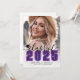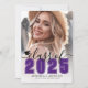 Anúncio de Graduação e Convite para Festa Moderno Clássico. A frente apresenta uma foto de página inteira com um gradiente branco na parte inferior que se funde perfeitamente na imagem. Sobre o gradiente, o ano aparece em uma fonte clássica escolar roxa negrito. Logo acima, "Turma de" é escrito em uma elegante letra cursiva preta, de modo que fique 'Turma de 2026' ou qualquer ano. À esquerda do ano, há um pequeno ícone de boina de graduação personalizável, que você pode alterar para combinar com sua paleta de cores. Abaixo do ano, o nome do graduado e o nome da escola são exibidos de forma destacada. Todas as cores podem ser personalizadas para combinar com as cores da escola ou preferências pessoais.