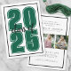 Convite de formatura vertical atemporal e convite de festa. A frente apresenta o ano "2025" em fonte grande e negrito, com "turma de" escrito de forma elegante em letra cursiva no meio. Esta versão apresenta uma paleta de cores clássica em verde, preto e branco, mas todas as cores - incluindo o ano, texto em letra cursiva e moldura - podem ser personalizadas para combinar com as cores da escola ou preferências pessoais. A cor do fundo também pode ser ajustada para um toque personalizado.