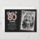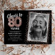 Convite de aniversário de oitenta anos elegante com fundo preto estiloso que pode ser alterado para qualquer cor, foto do aniversariante, brilho cintilante em rosa dourado, oitenta balões de hélio em rosa dourado e um modelo de texto de celebração de 80 anos moderno e fácil de personalizar.