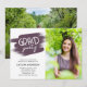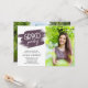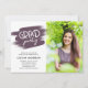 Este convite de festa de graduação oferece espaço para 2 fotos, uma vertical na frente e uma segunda horizontal no verso. O design é acentuado com pinceladas de tinta roxa escura.