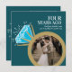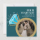 Convide amigos e familiares para uma festa especial de aniversário de quatro anos de casamento ou celebração de jantar com este anel de eternidade gráfico com topázio azul e brilho branco, e convite de dois fotos, de então e agora. Personalizado com suas próprias fotos do dia do casamento e uma foto atual no verso, e adicione suas próprias palavras de celebração, data da festa e local. Outros itens correspondentes e anos de aniversário estão disponíveis. Arte e design gráfico original do anel por www.mylittleeden.com no Zazzle.