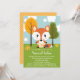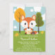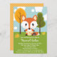Uma raposa de bebê vermelha e branca, cor de laranja, veste um par de fraldas amarelas seguradas por um pino de fralda. Uma bolota senta perto da cauda arbusta. Estes convites para o chá de bebê com sexo neutro para raposa e convites com árvores coloridas do outono e folhas de carvalho num dia de nuvem brilhante e inflexível são perfeitos para um chá de fraldas temático de amigos da floresta no outono para a mãe esperando um bebê ou uma menina. Trabalho de arte © Chrissy H. Estúdios, LLC. Todos os direitos reservados.