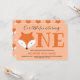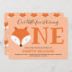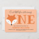 Um primeiro convite de aniversário para bebês que diz "Nossa raposa está virando uma". Este convite é laranja e marrom com a palavra "Um" em letras grandes, com uma ilustração do rosto da raposa como primeira letra da palavra. Simplesmente, personalize este convite, adicione-o ao seu carrinho e feliz aniversário ao seu maravilhoso bebê! Fox Transformando Um Primeiro Aniversário Convocando Design de Feriado | ©Melissa Patton — Artista/Ilustrator