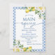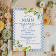 Frame Yellow Floral Lemon Themed Chá de panela Ela encontrou seu chá de panela de aperto principal apresentando algumas flores amarelas e brancas, limões e folhagem e uma fronteira de azulejo azul-mediterrânica. Ideal para primavera ou chá de panela de verão.
